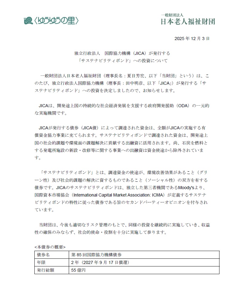 独立行政法人 国際協力機構(JICA)発行の 「サステナビリティボンド」への投資について 2025年12月3日 一般財団法人日本老人福祉財団は、このたび、独立行政法人 国際協力機構(JICA)が発行するサステナビリティボンドへの投資を決定しましたので、お知らせします。 JICA_20251203 当財団は、今後も社会貢献活動に取り組んでまいります。